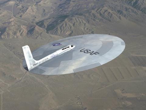 Caption Photos of US insignia aircraft made to look like science fiction imagined flying saucers. The Next Global Threat? A Super Ali Baba Plus Plus arriving in UFOs to terrify all mankind into uniting under the rule of one-world government? (The U.S. Air Force first began experimenting with flying saucers in the 1950s. Why - to deceive the former USSR, or, to induce global mass panic? See Hadley Cantril )